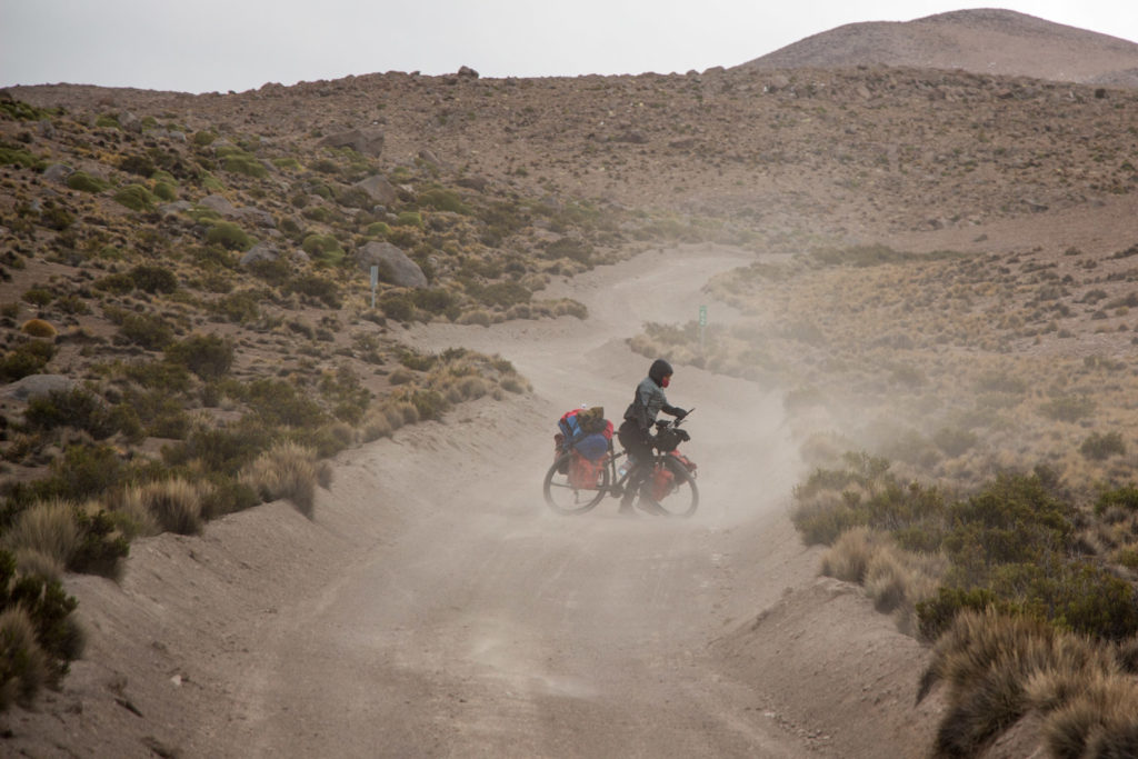 Wir kochen noch in der Kirche, packen alles zusammen und machen uns auf den Weg. Es sind vereinzelte Schneestürme, zwischendurch Sonne. Das Wetter spielt verrückt aber auf dieser Seite des Berges bleiben wir von großen Schneemengen verschont. Aber wir haben von der Früh weg GegenSTURM!! Allein der Weg zum Pass ist extrem anstrengend, obwohl es nicht viel Höhenmeter sind. Wir müssten nicht zwingend über den Pass. Es gäbe auch eine Variante über Bolivien, die kürzer und mit weniger Höhenmeter wäre – aber illegal und wir denken, sollte uns ein Schneesturm richtig treffen kommt hier vermutlich nicht so schnell jemand vorbei wie auf dem anderen Weg. Noch dazu haben unsere Radfreunde aus Grenoble auf dem Weg über den Pass ihre Kamera verloren. Wir möchten diese unbedingt finden. Somit fällt die Entscheidung für den Pass und natürlich die legale Variante.