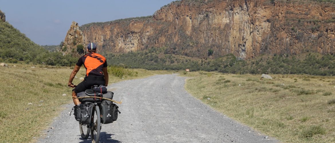 Am nächsten Tag fahren wir durch den Hell’s Gate National Park, den einzigen Nationalpark in Kenia, den man mit dem Rad durchfahren darf. Lange überlegen wir, ob wir diesen Park umfahren sollen, da der Eintritt mit 50€ pro Person unglaublich teuer ist und in keiner Relation zu den Preisen hier in Kenia steht. Egal, wir sind nur einmal hier, also fahren wir.